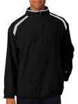93% Polyester/7% Spandex • Water and wind resistant • Contrast shoulder inserts on front and back • 9" Locking zipper front with self fabric collar • Two front zippered welt pockets • Open bottom with bungee cord and hidden toggles on side seams • Elastic in hem on back for a snug, but not tight fit • Cuffs feature smooth hem front with elastic on back half • Embroidered Badger logo on left sleeve • Sizes: XS-4XL